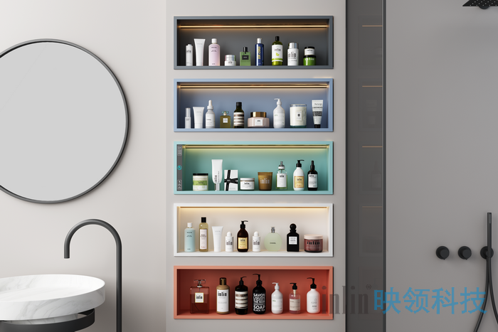 壁龛简介:我们在珠宝首饰店里会看到贵重物品都是放在壁龛内展示的,装有映领彩色莫兰迪色系壁龛的场景空间,会使收纳置物空间翻倍增加,而且瞬间变得梦幻般的童话世界、颜色淡雅温和、彩色而不腻、艺术奢华、精致智能、科技感十足。映领智能壁龛装有映领自主研发设计的智能模块、无需联网即可声控的声控模块控制模块(支持普通话、粤语高灵敏度控制)、触摸开关控制模块,照明灯饰,支持多个产品互连一键控制、一语音控制;伸缩挂巾杆、12V低电压直流电源;具有扩大室内空间的功能,极致扩大空间的利用率,墙面视觉得以延伸。并且装饰效果非常明显,现代家居已经不限使用于浴室、卧室、玄关、背景墙等任何场景空间;