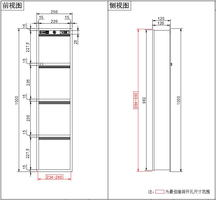 墙面开洞尺寸:宽984~990x高235~240x深125mm(以横向的MC4-1为例,竖向同理)