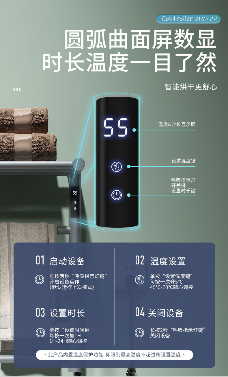 ●调温45℃55℃60℃65℃70℃、●内置数显控制器、●微蓝光电源指示灯、●层架收纳、●温度保护、●智能定时(1H~24Hour)、微电脑控制中心