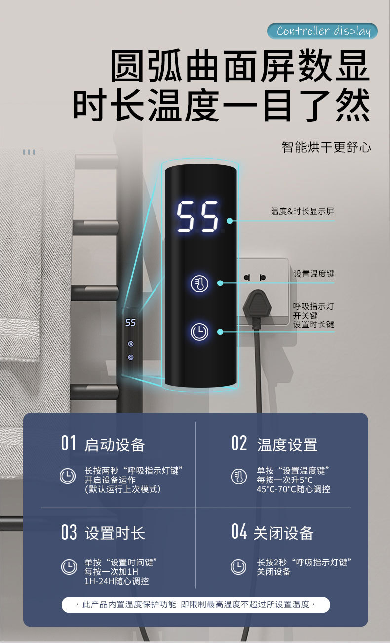 ●调温45℃55℃60℃65℃70℃、●内置数显控制器、●微蓝光电源指示灯、●温度保护、●智能定时(1H~24Hour)、微电脑控制中心